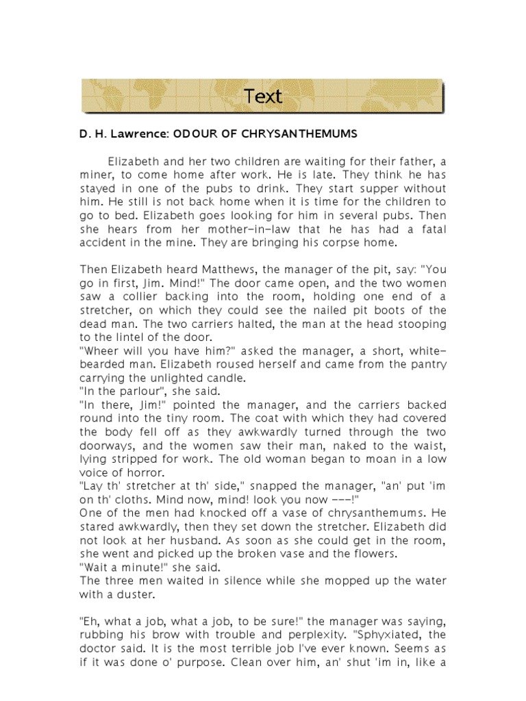 Lawrence explores the concept of. You may be offline or with limited connectivity. Odour of Chrysanthemums is a short story by D.
